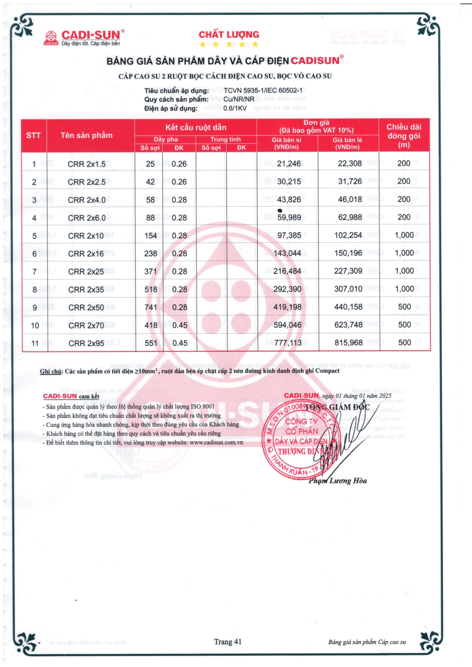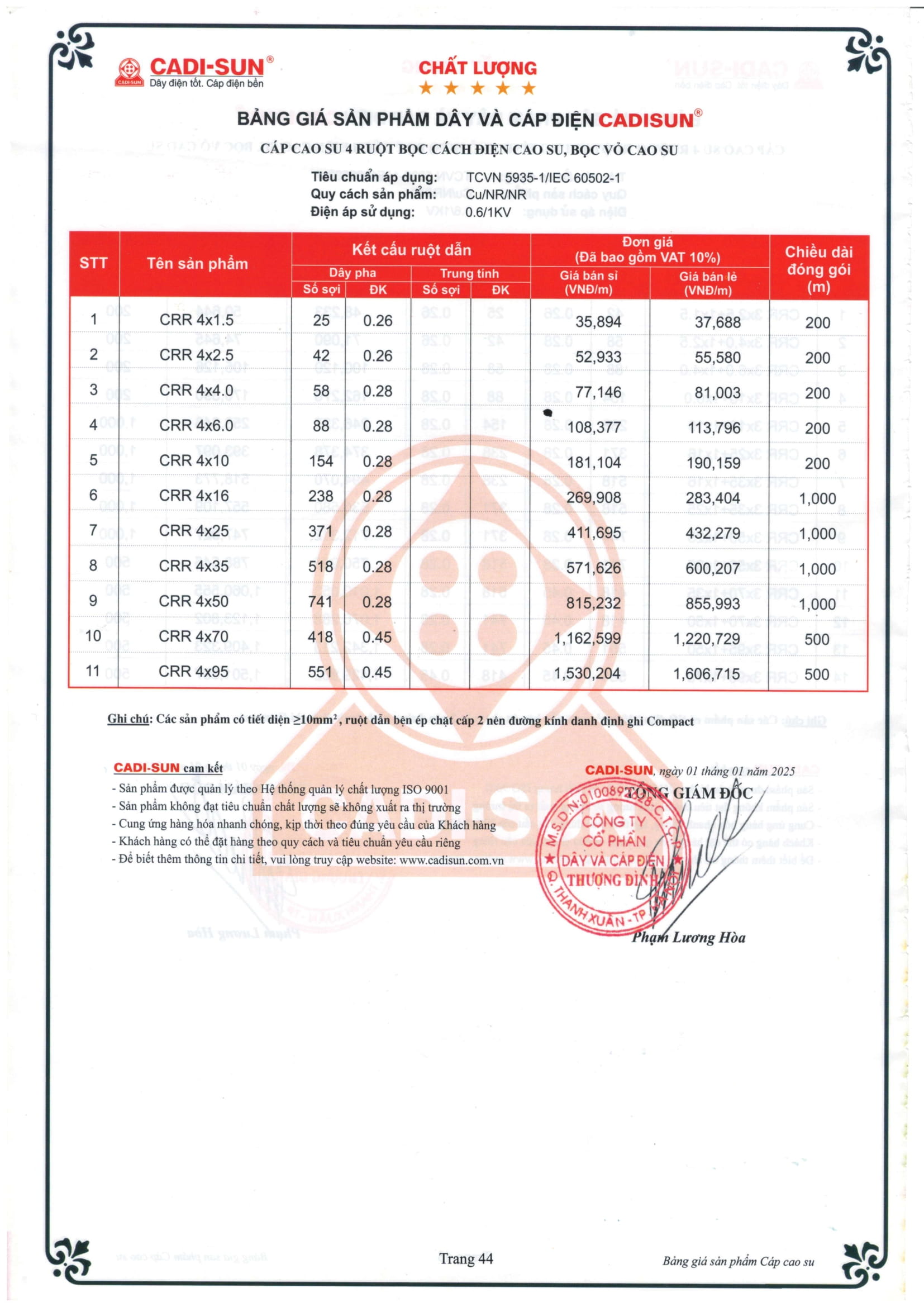 Bảng giá cáp hàn hồ quang Cadisun mã CNR