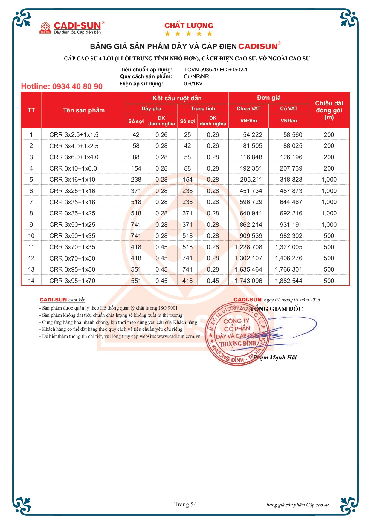 Bảng giá cáp cao su Cadisun mới nhất 2026