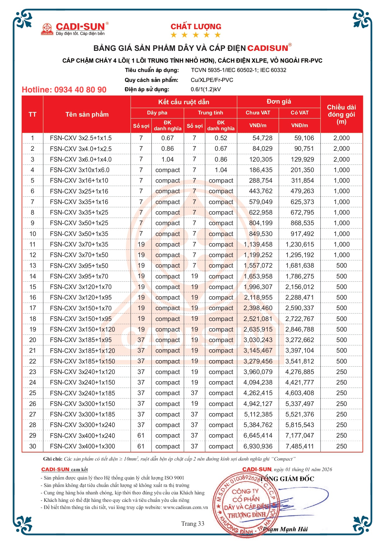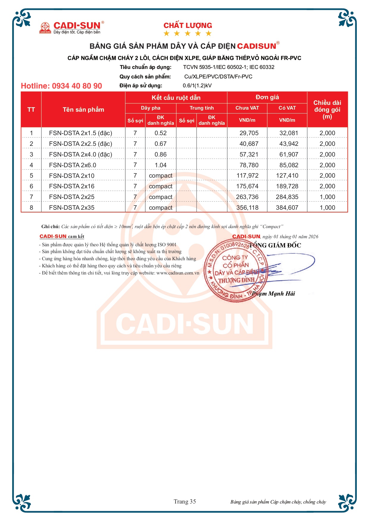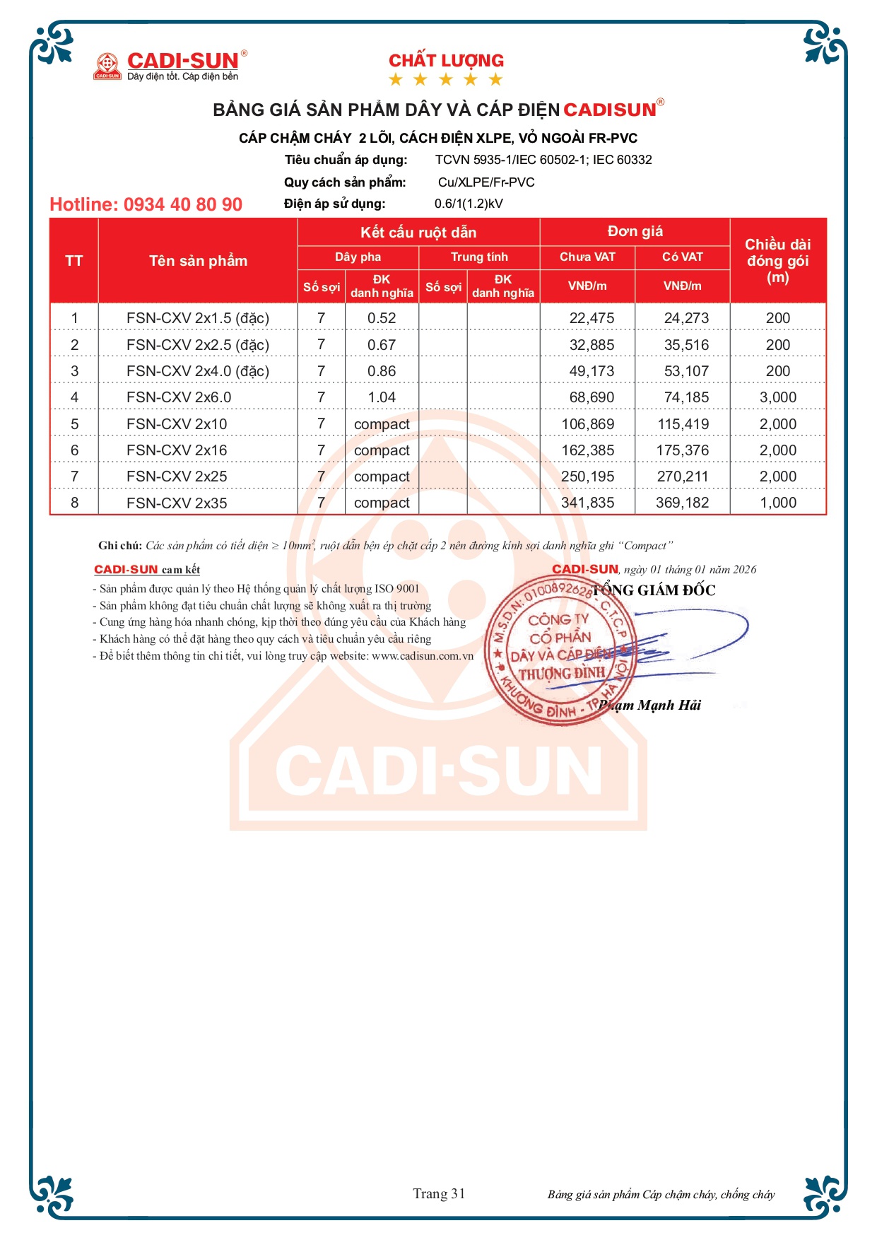 Bảng giá cáp chậm cháy Cadisun mới nhất 2026