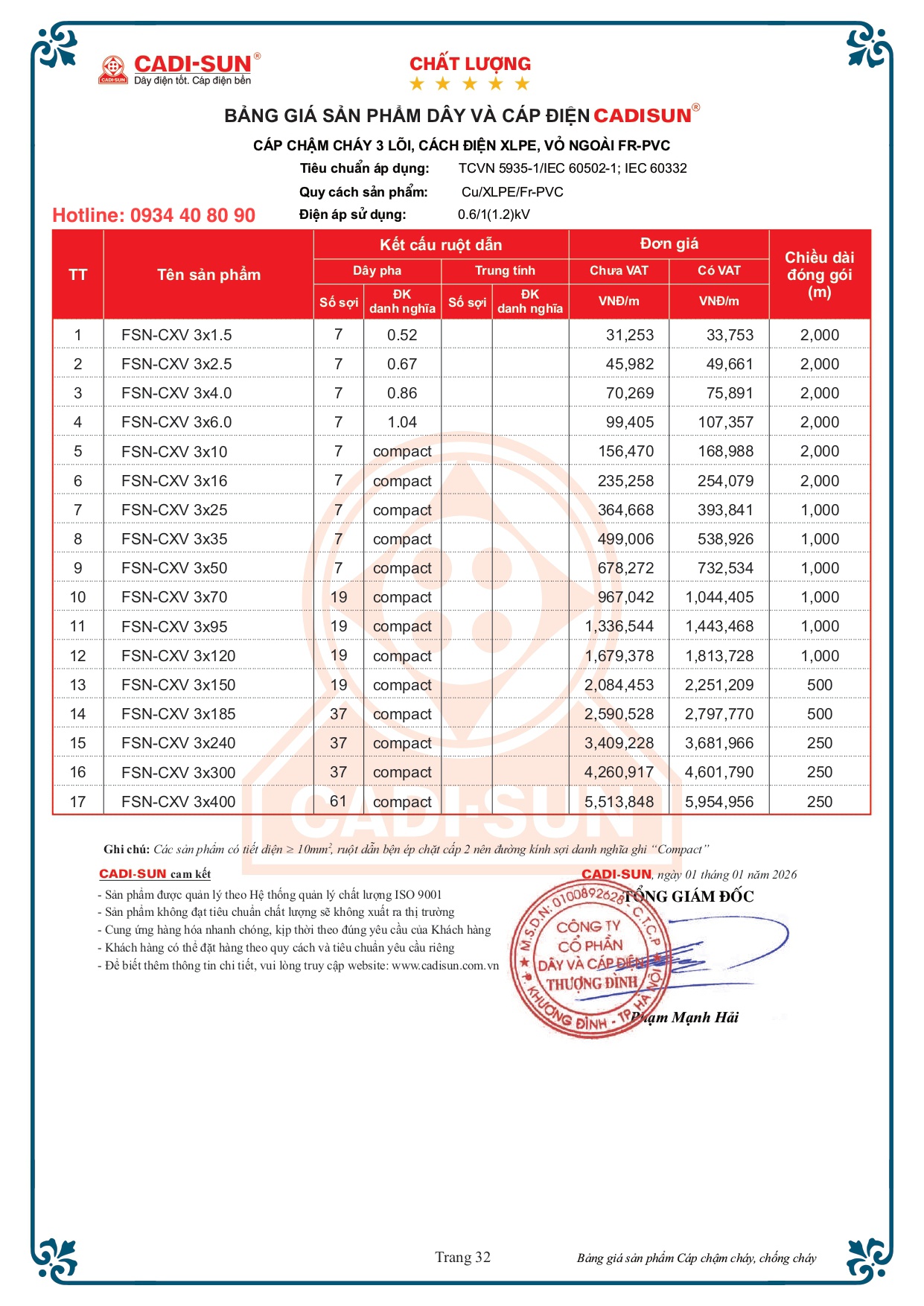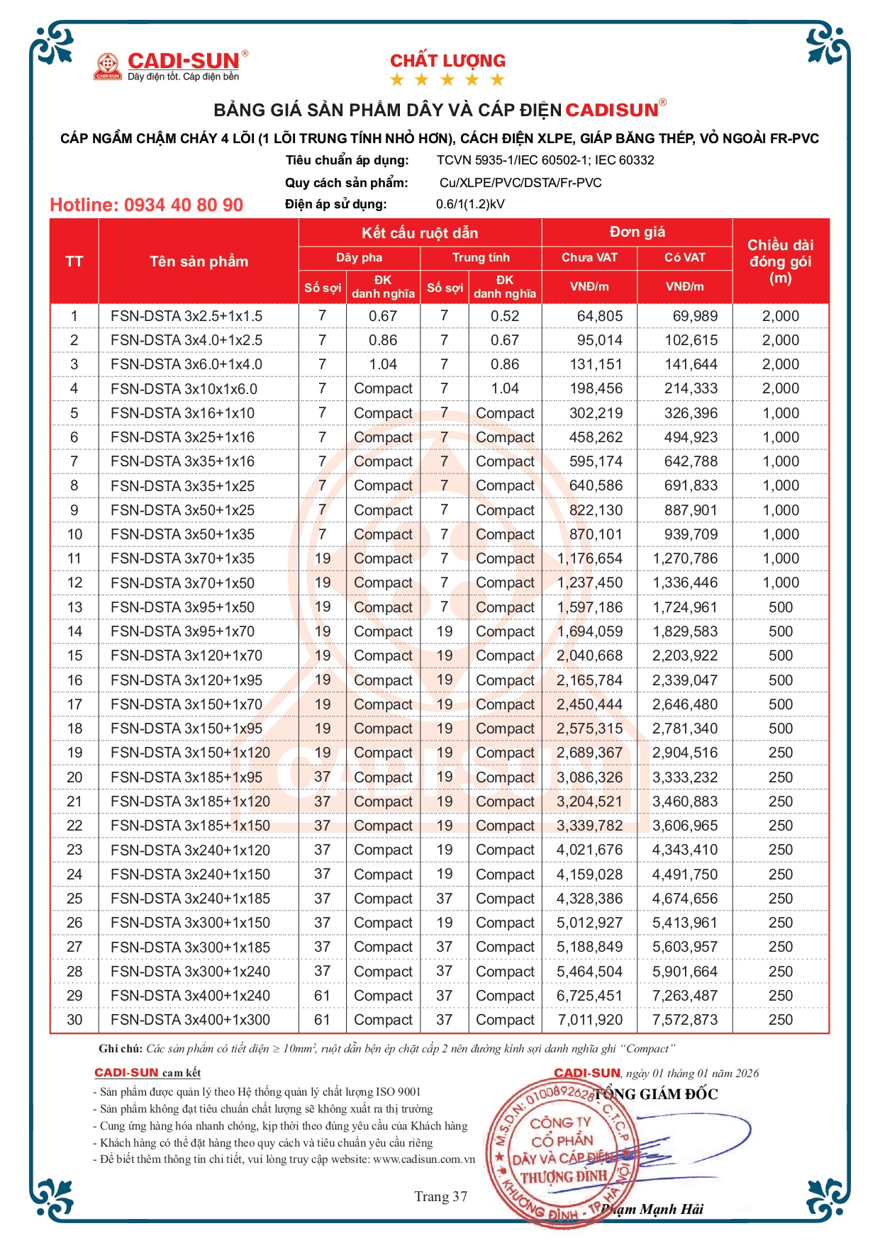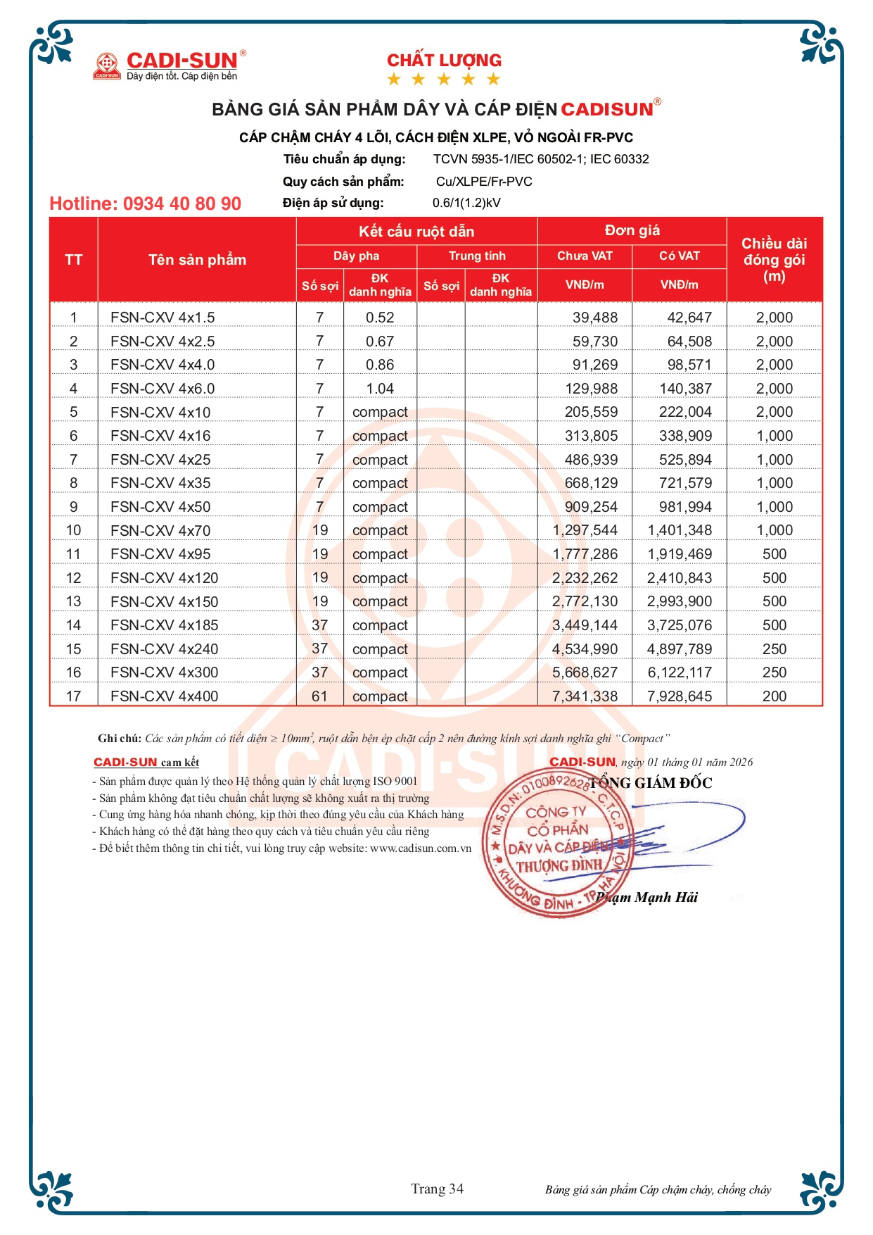 Bảng giá cáp chậm cháy Cadisun mới nhất 2026