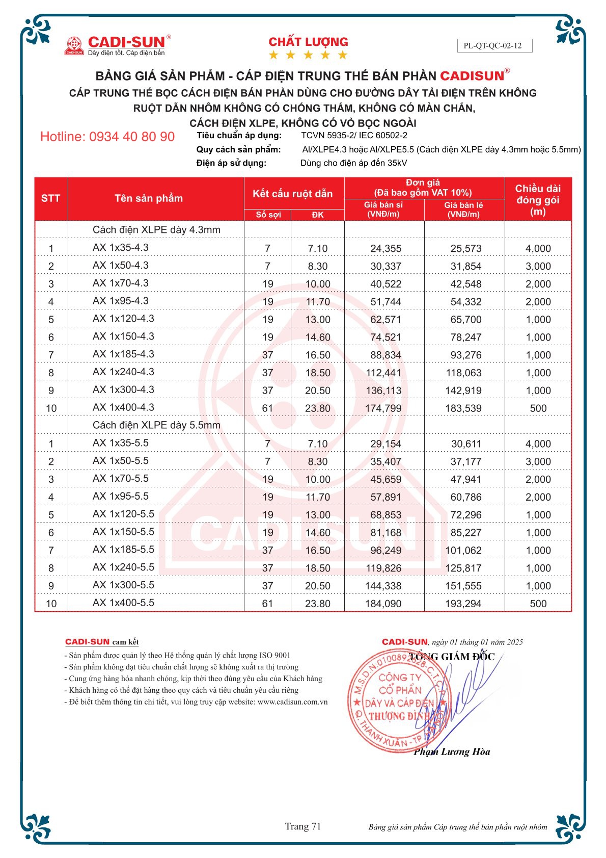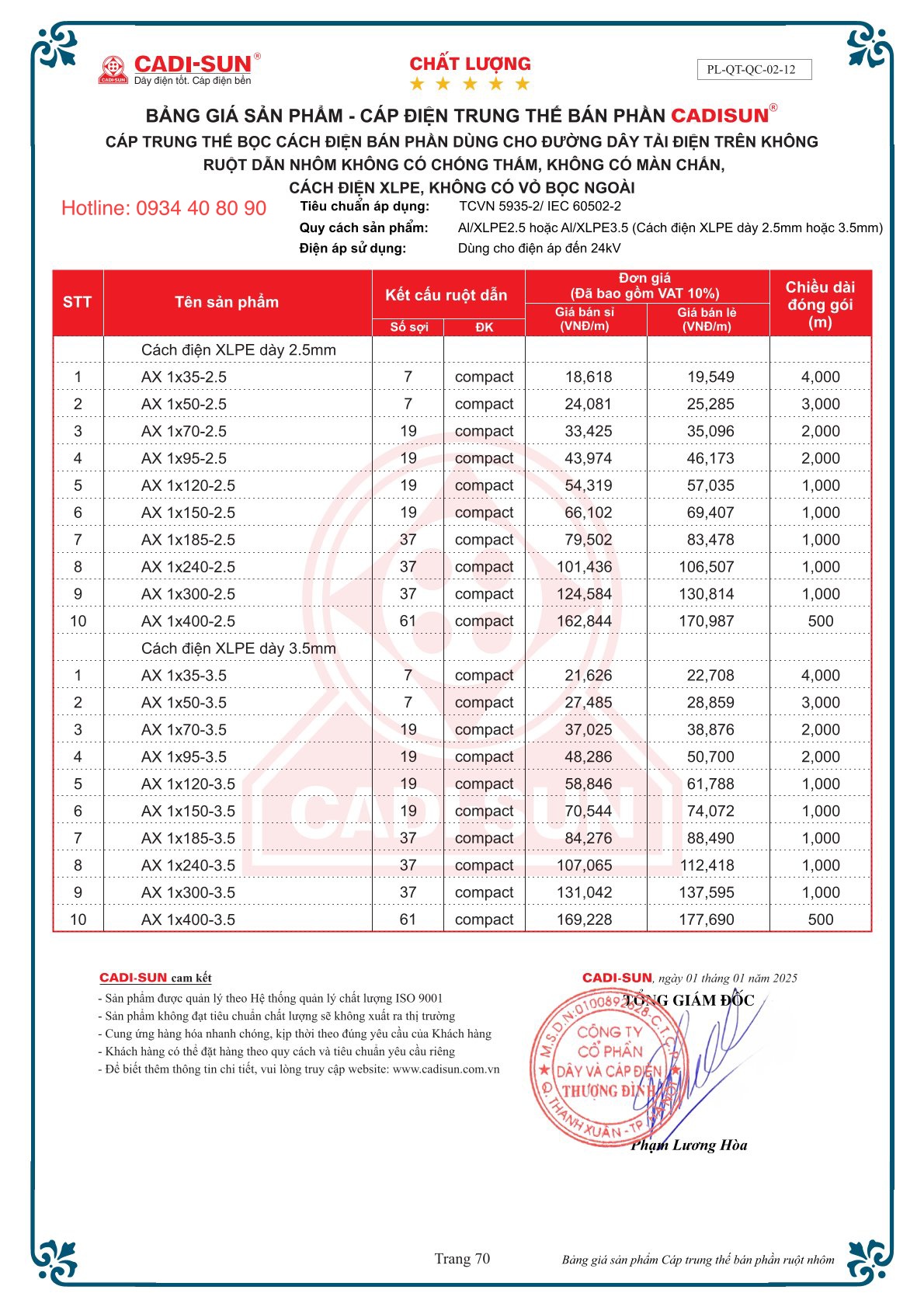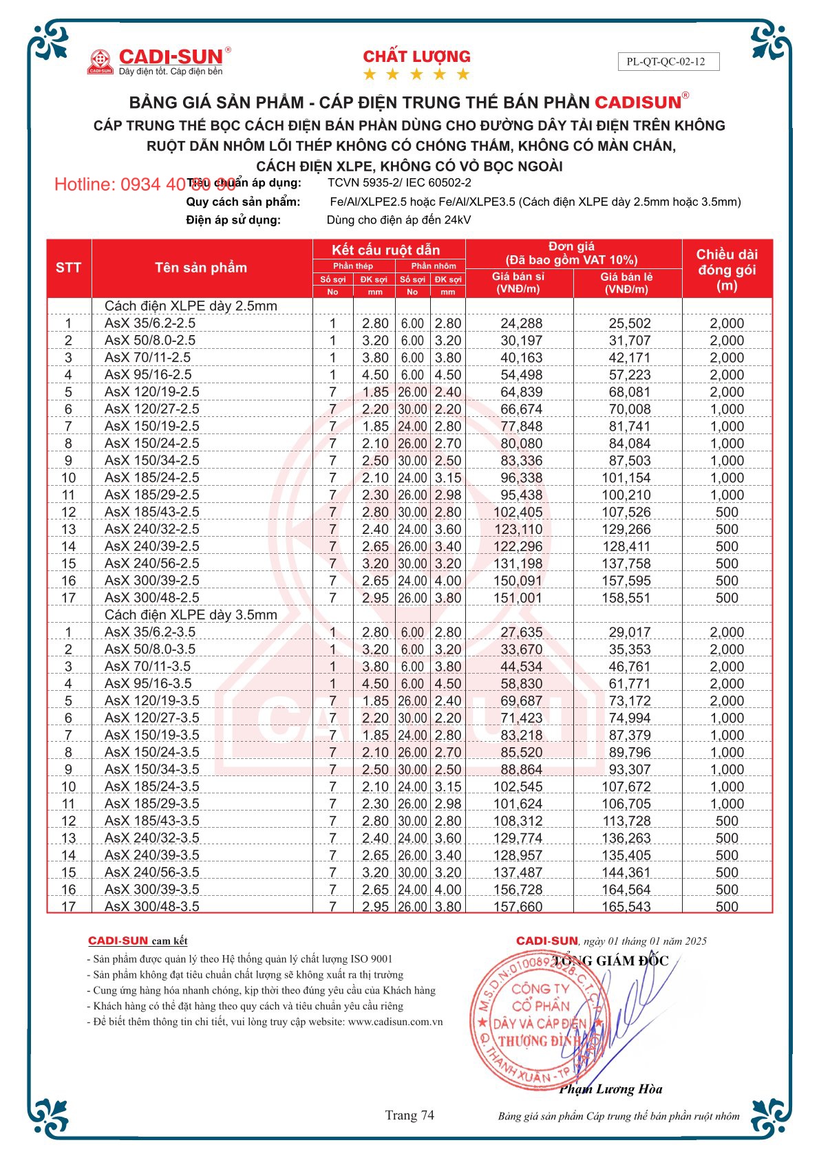 Bảng giá cáp nhôm hạ thế Cadisun 2025