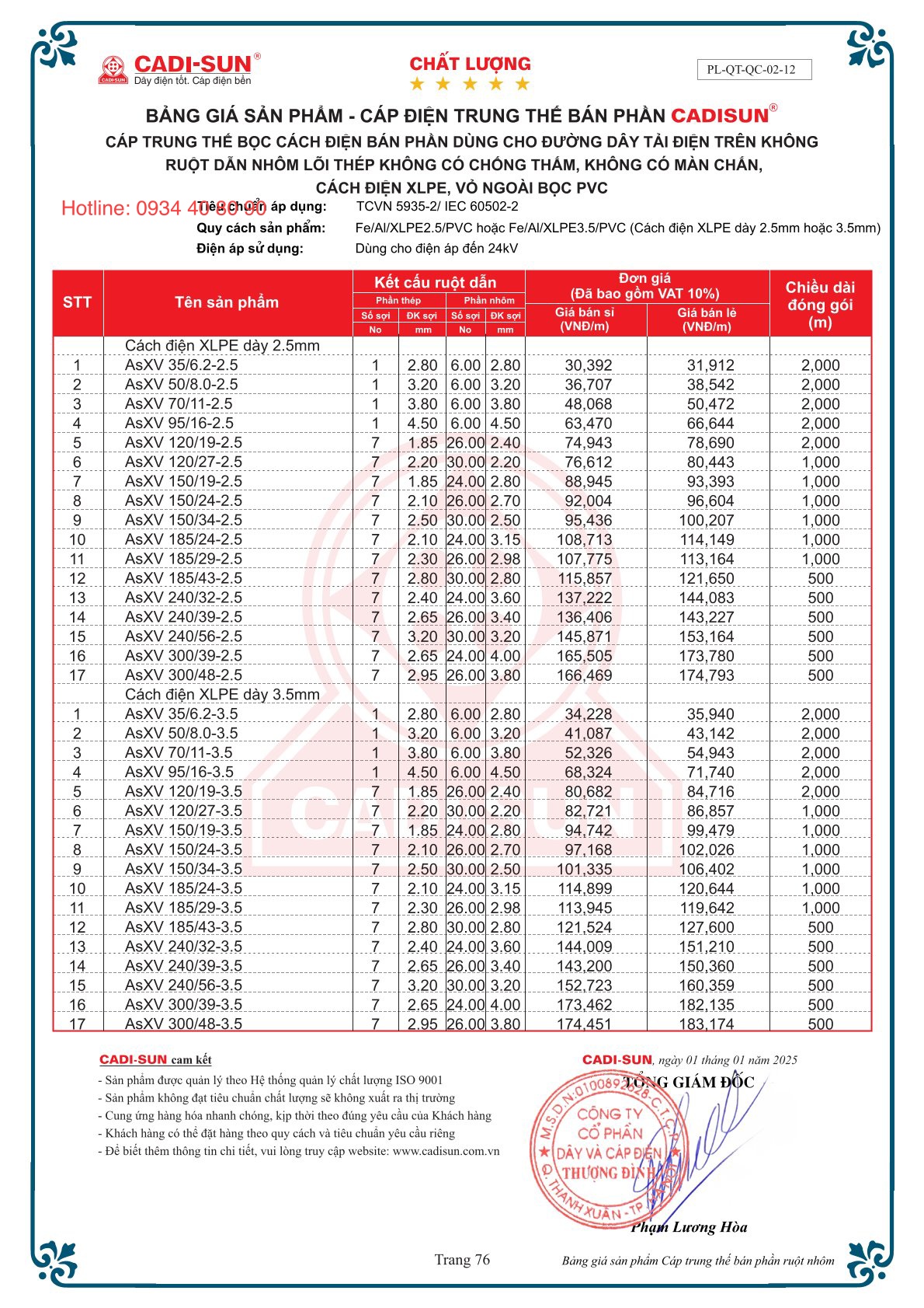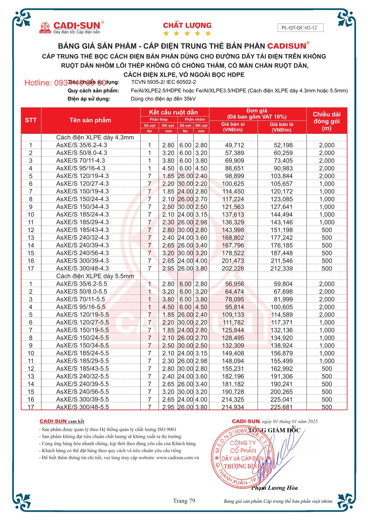 Bảng giá cáp nhôm trần lõi thép Cadisun mã As