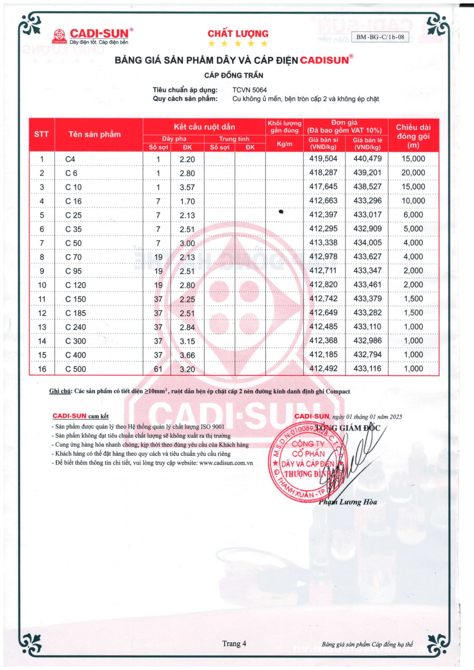 Bảng giá cáp đồng trần Cadisun mã C, CF