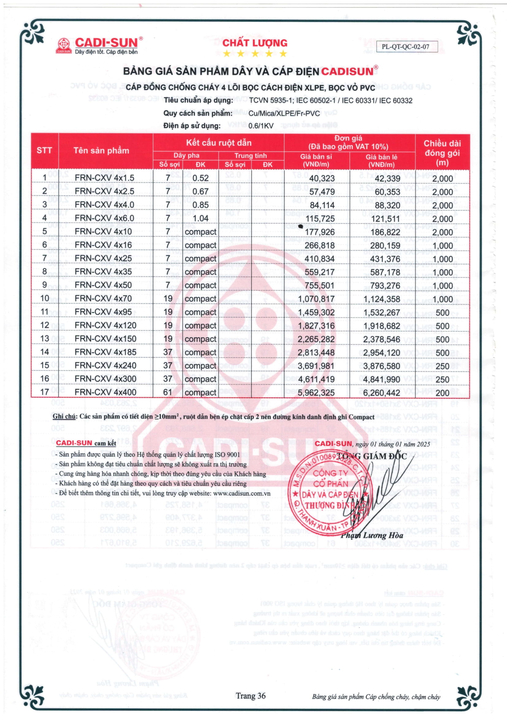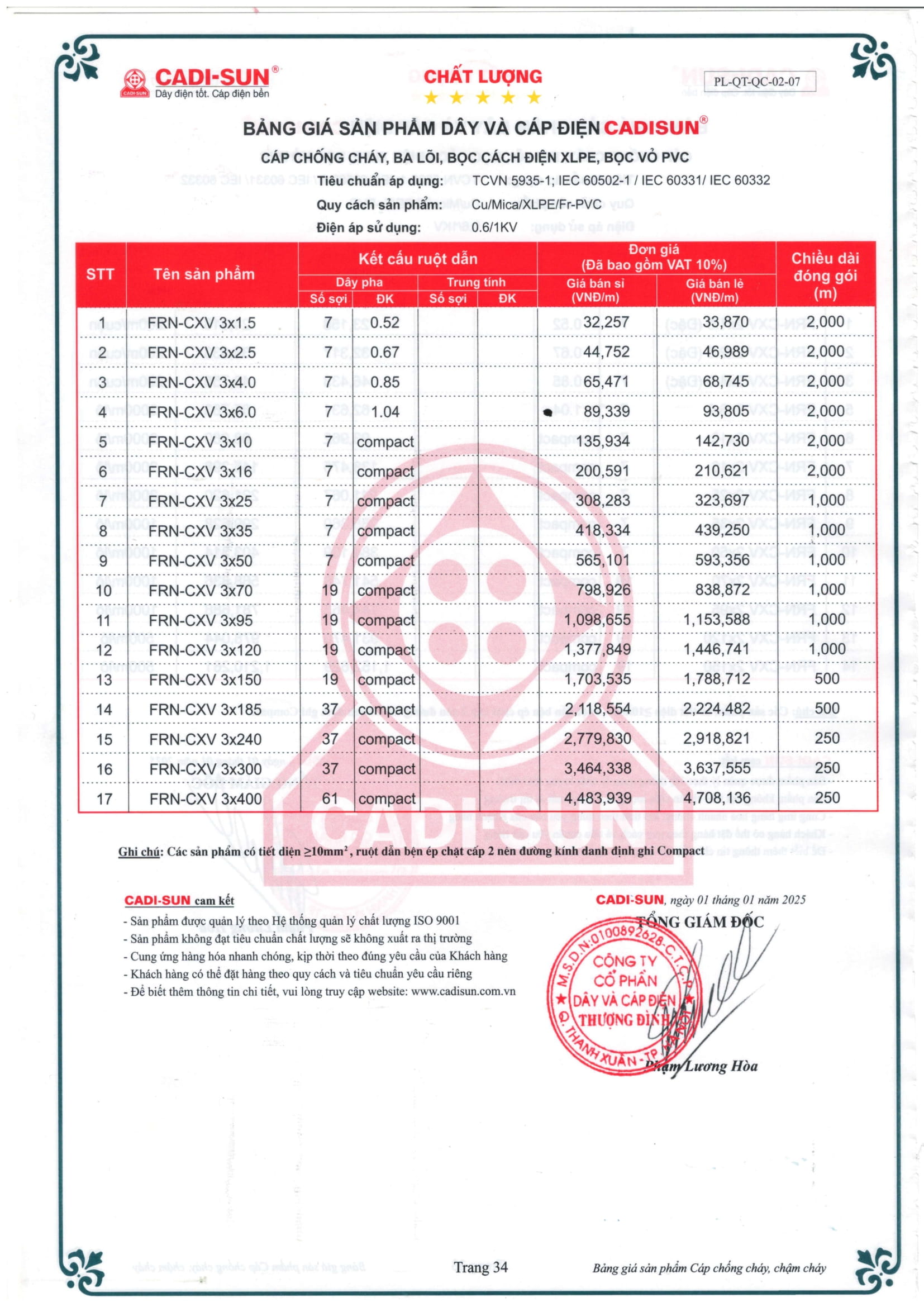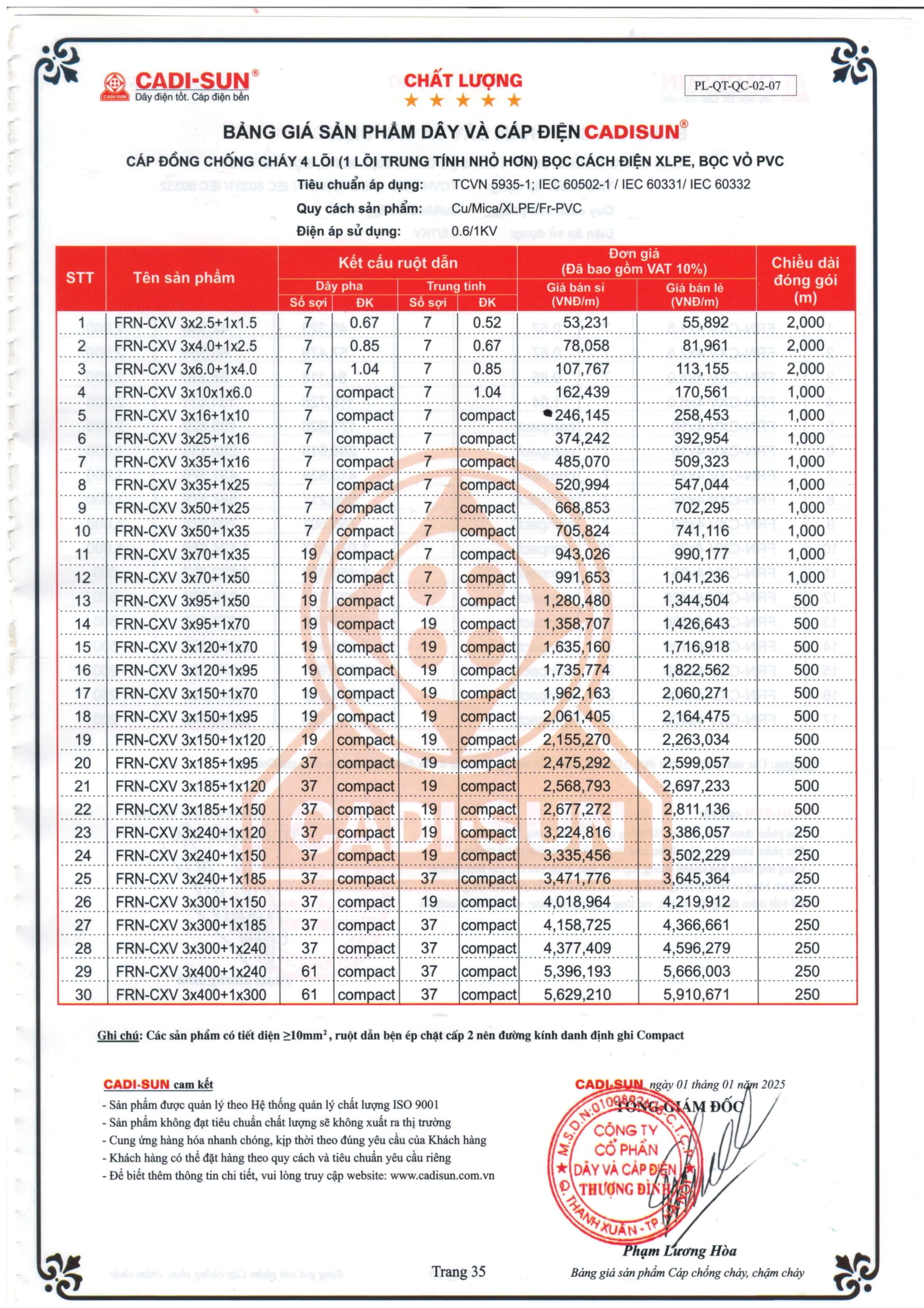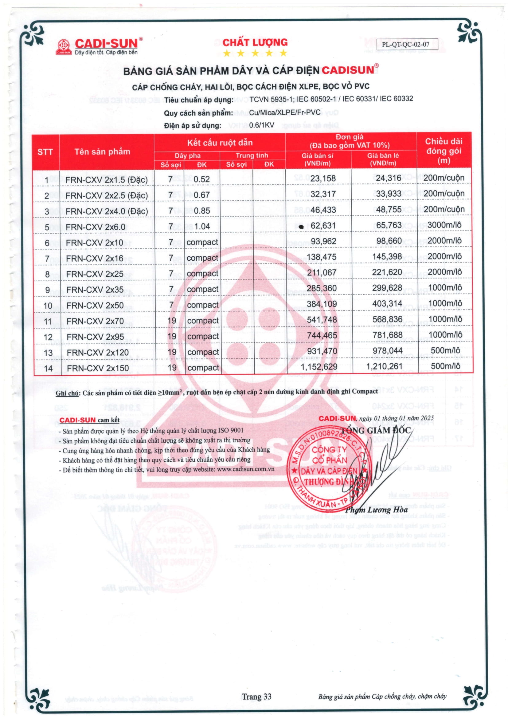 Bảng giá cáp đồng chống cháy Cadisun FRN-CV bọc cách điện PVC