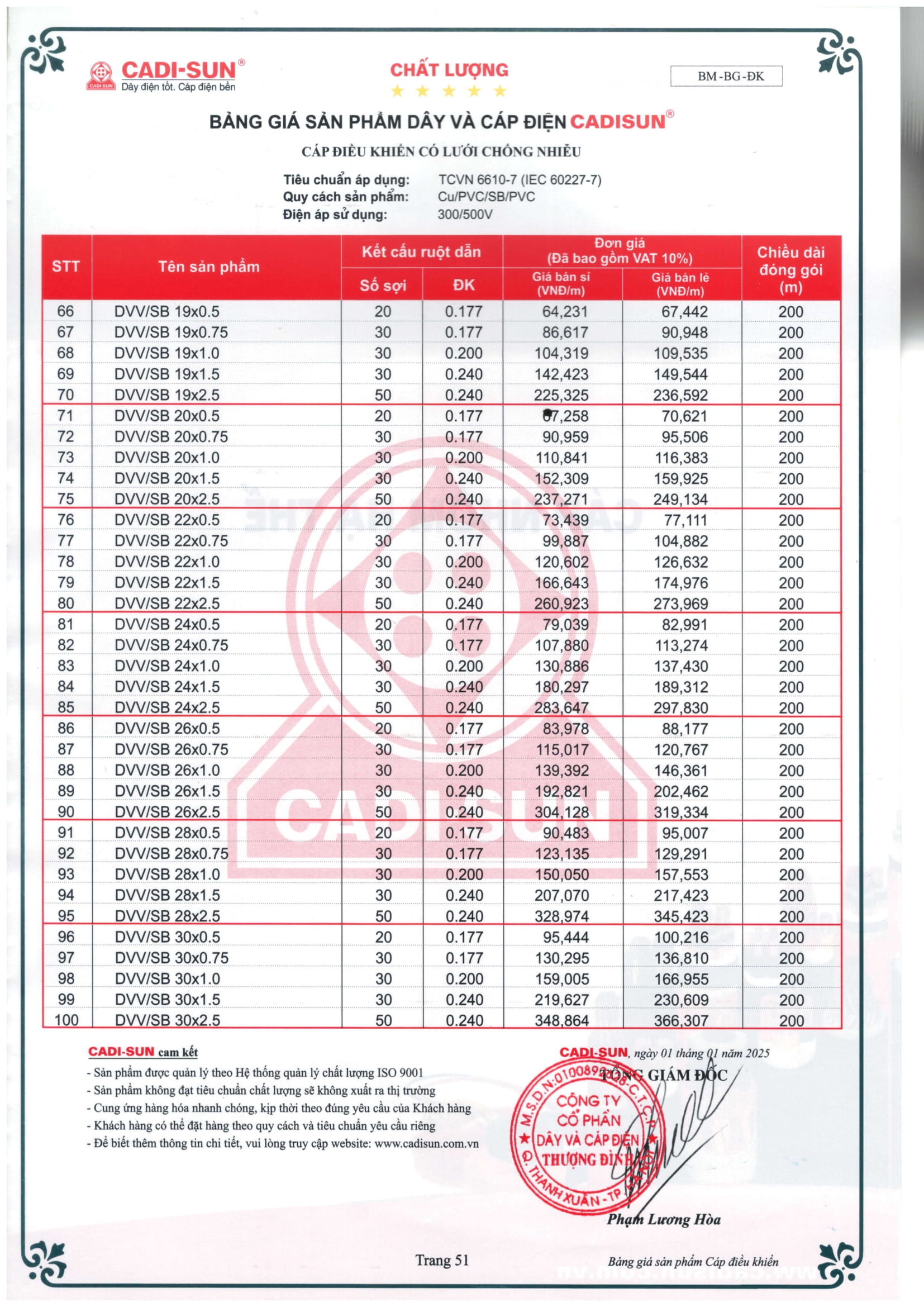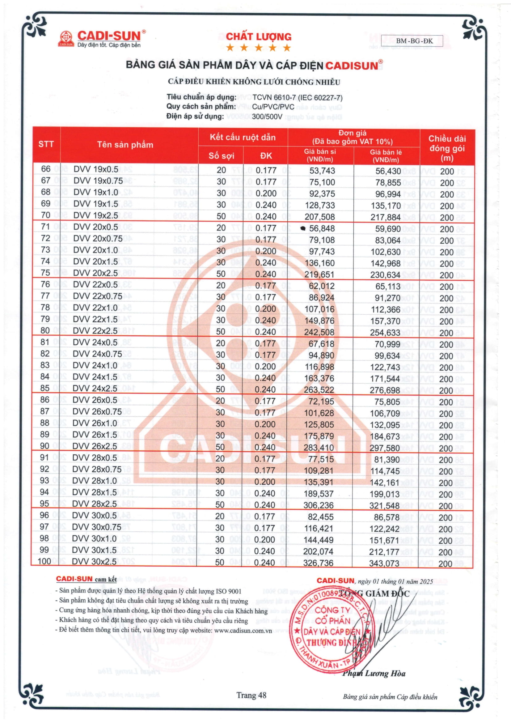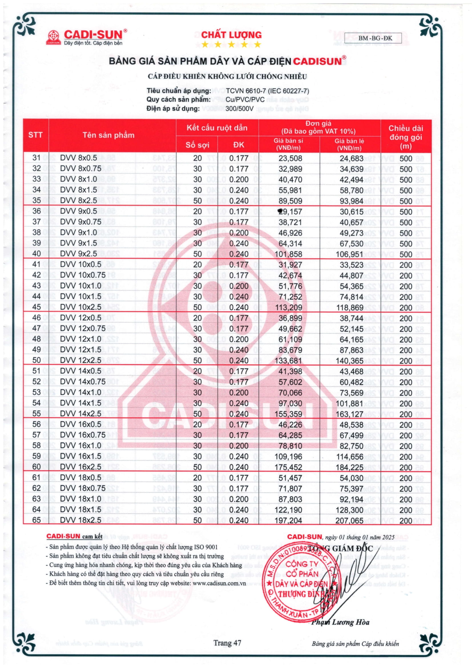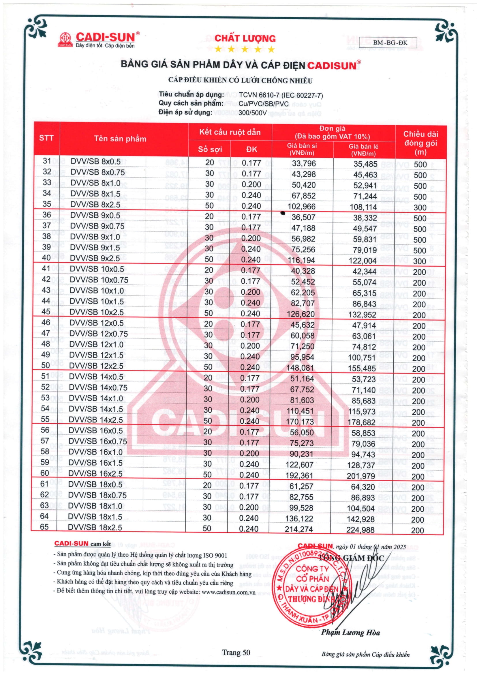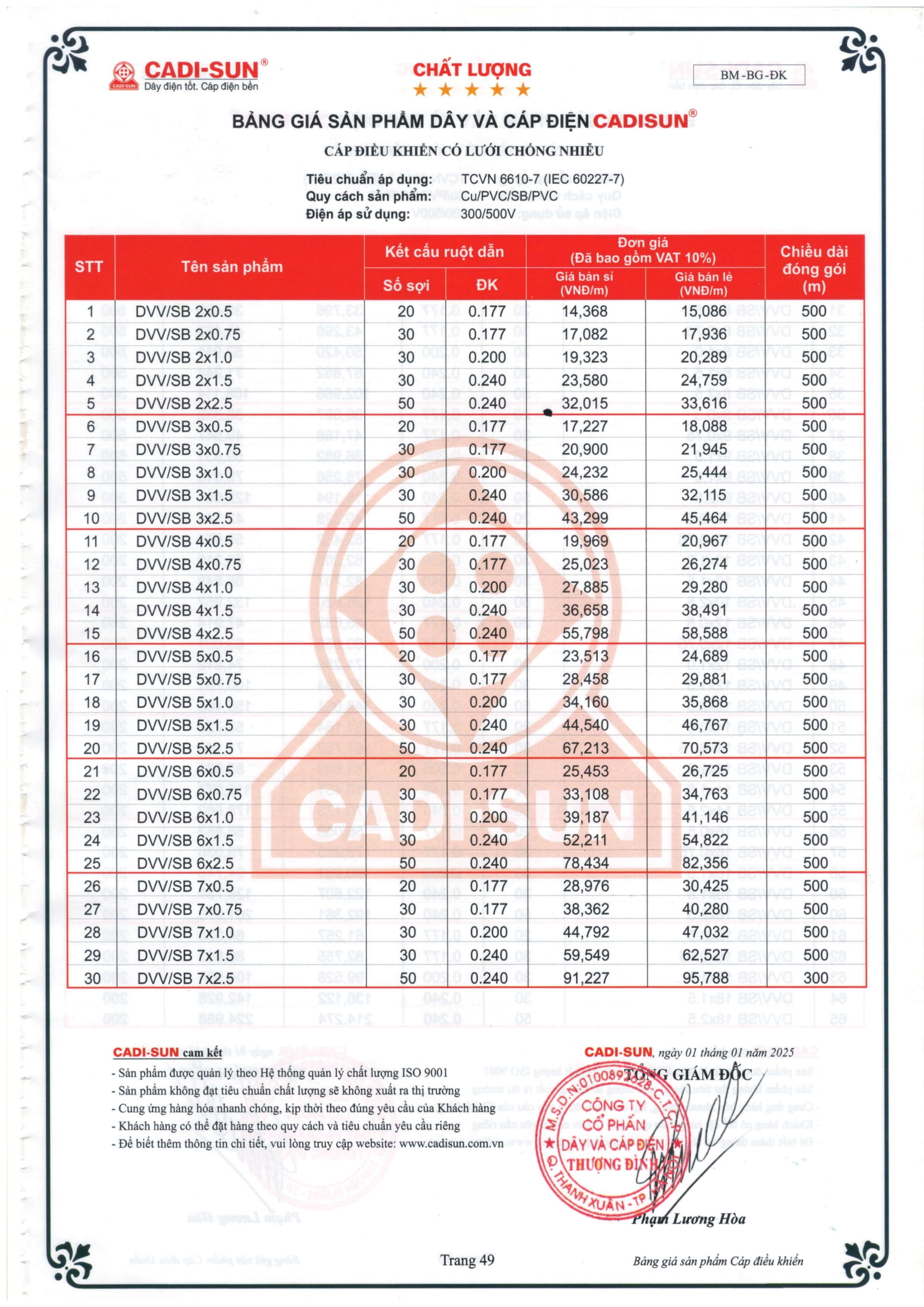 Bảng báo giá cáp điều khiển Cadisun 2025