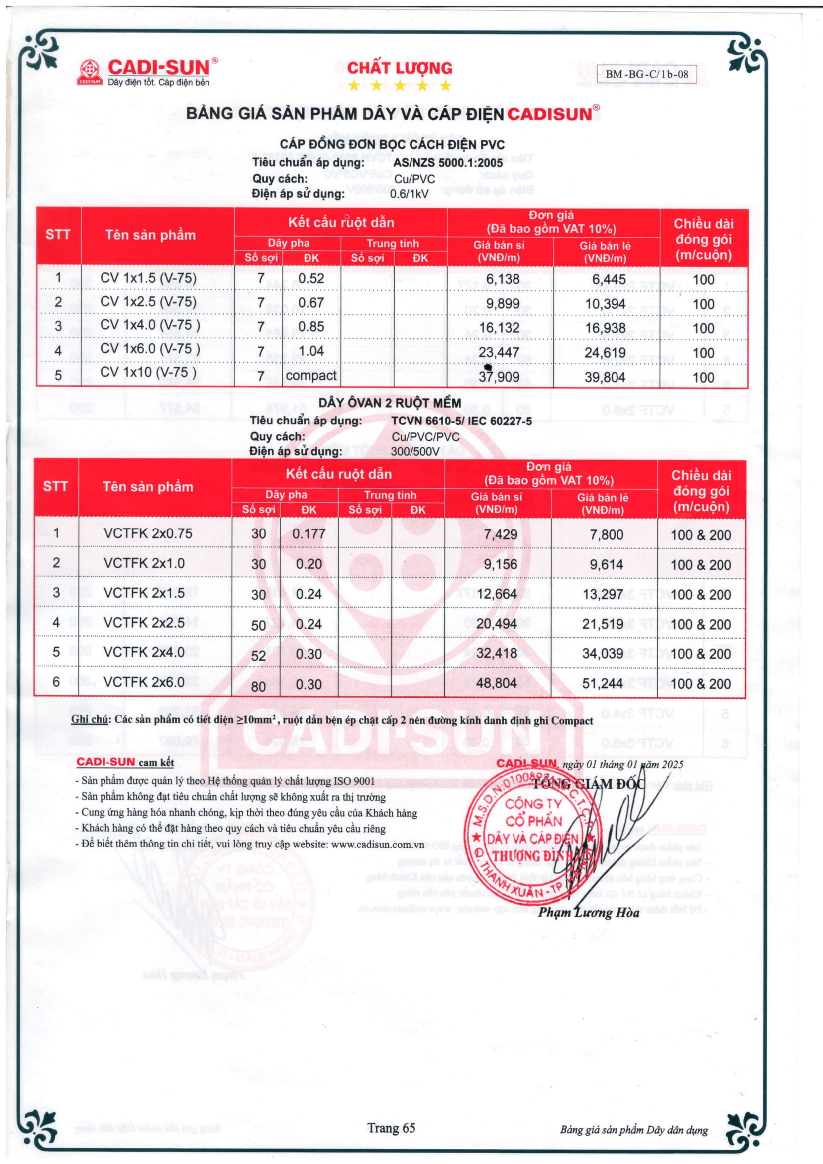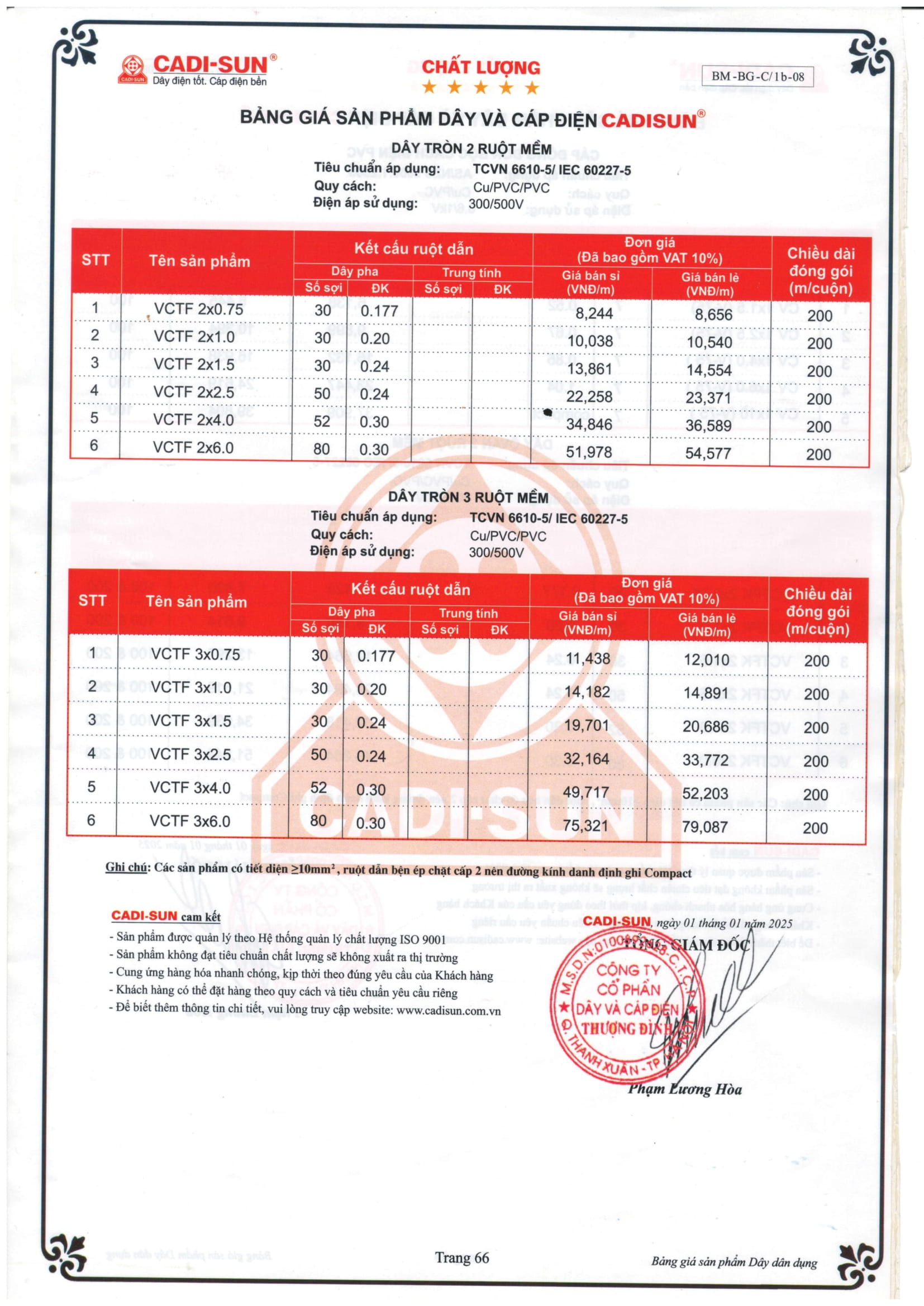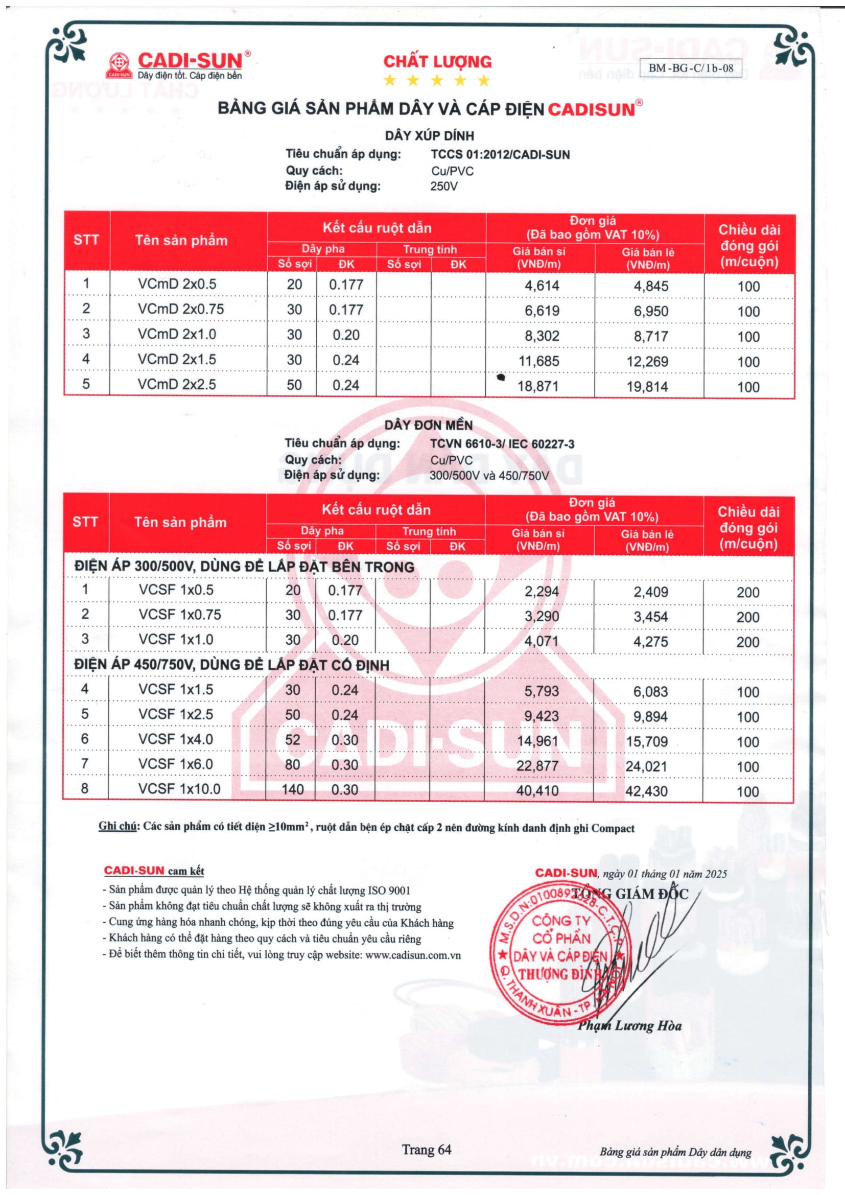 Bảng giá dây Cadisun xúp dính VCmD và dây đơn mềm VCSF