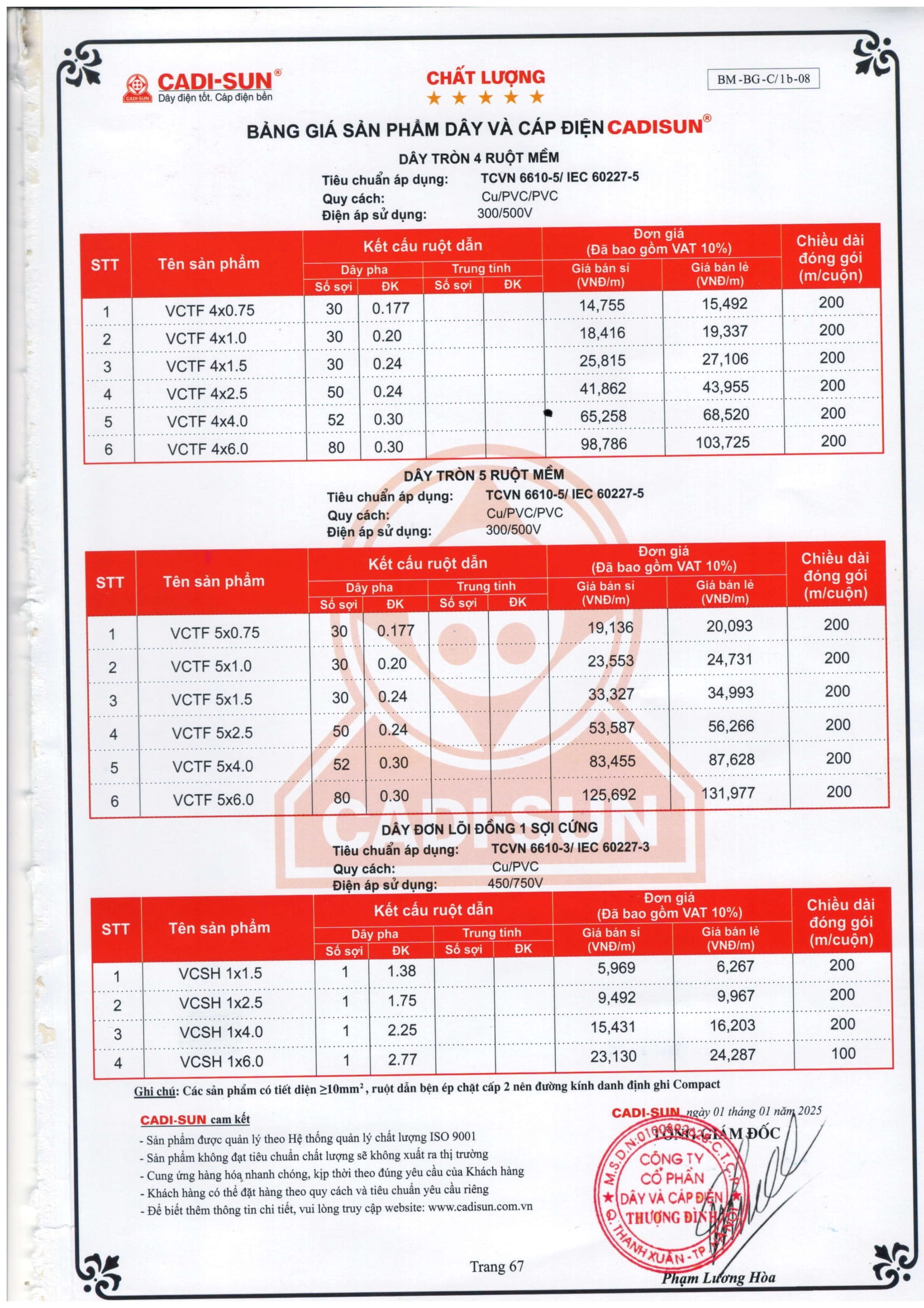 Bảng giá dây điện Cadisun tròn ruột mềm mã VCTF và dây đơn lõi đồng mã VCSH