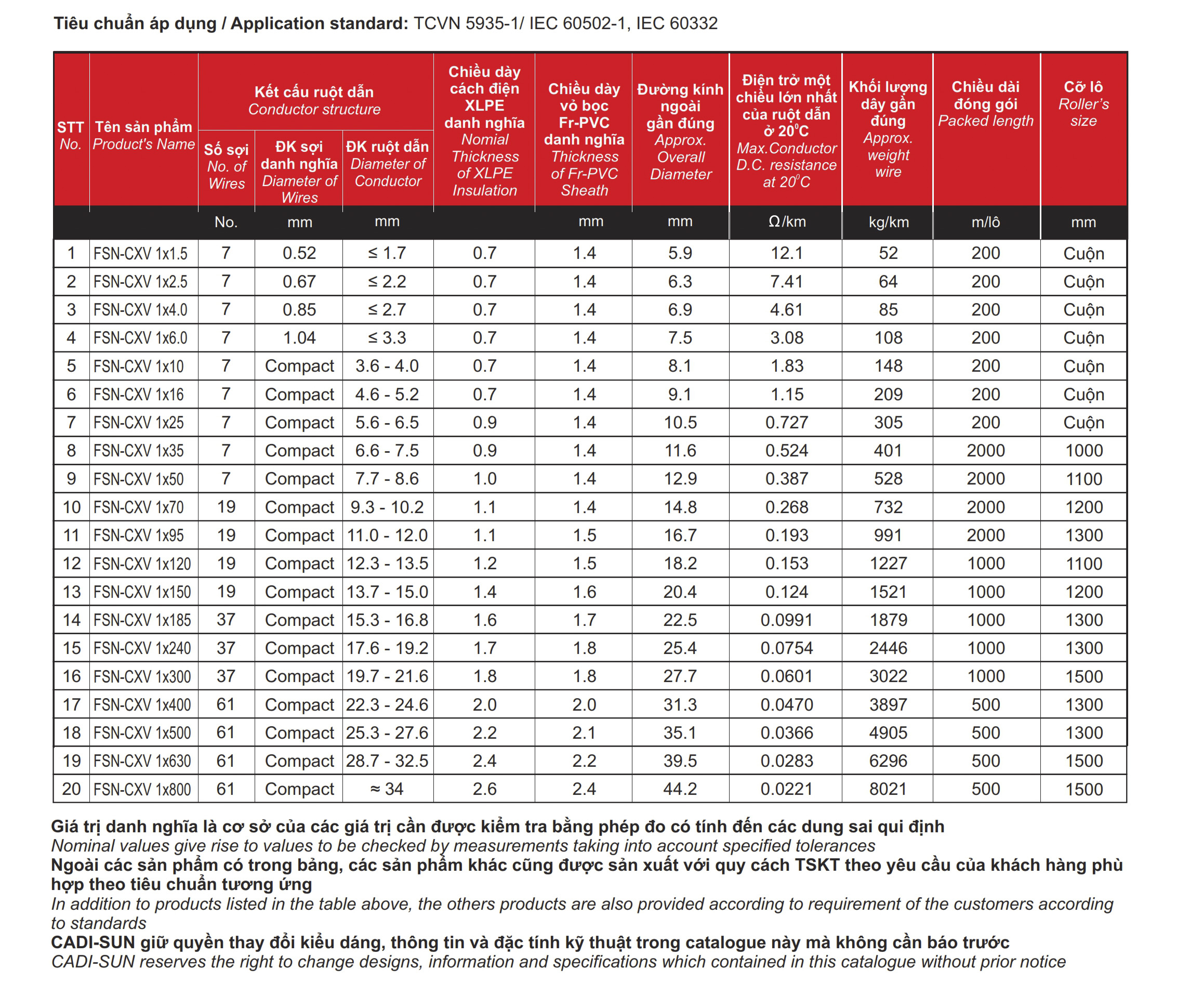 1.Tiêu chuẩn áp dụng Cáp chậm cháy CADISUN FSN-CXV 3X + 1X