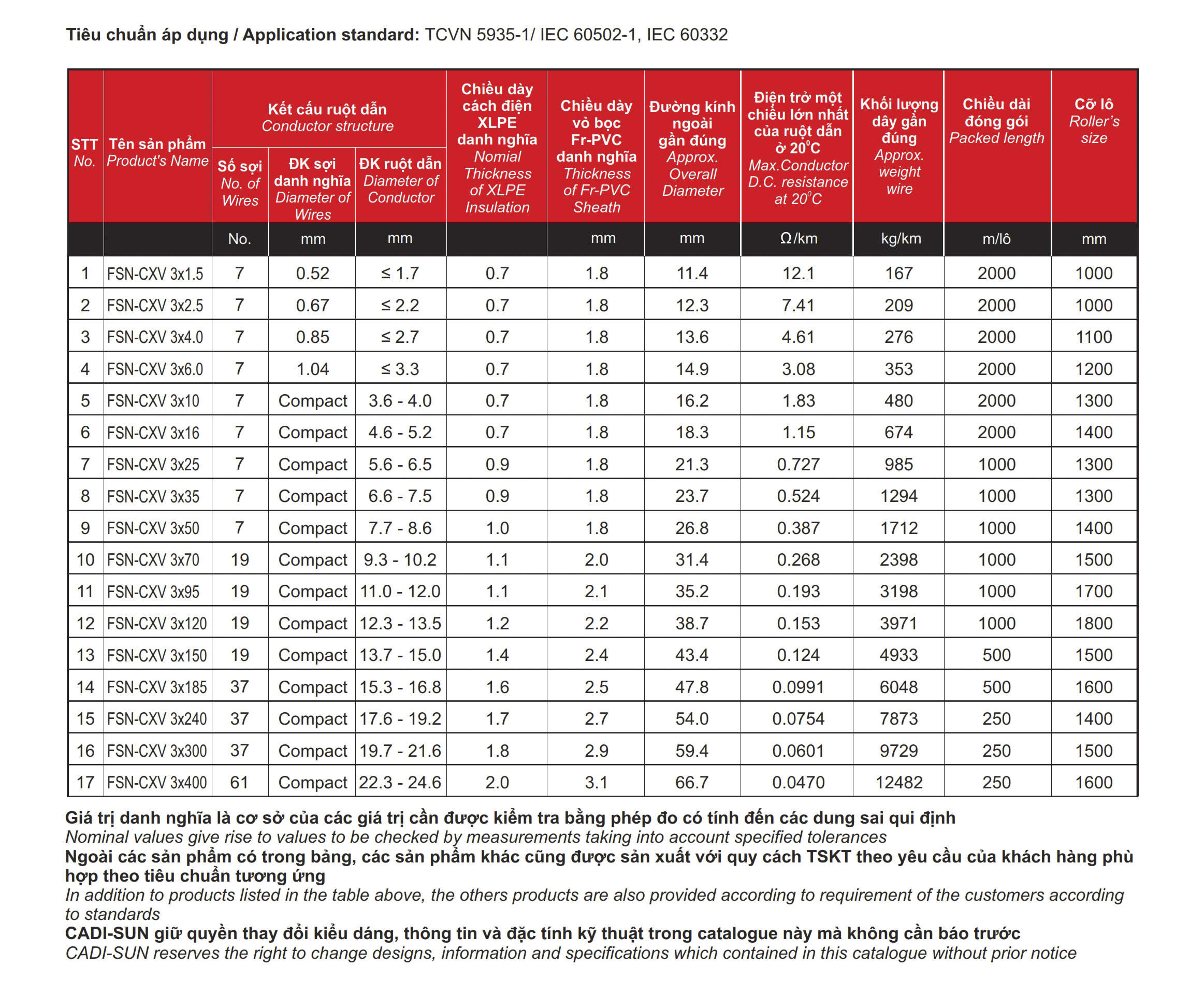 – Quy cách: Cu/XLPE/Fr-PVC