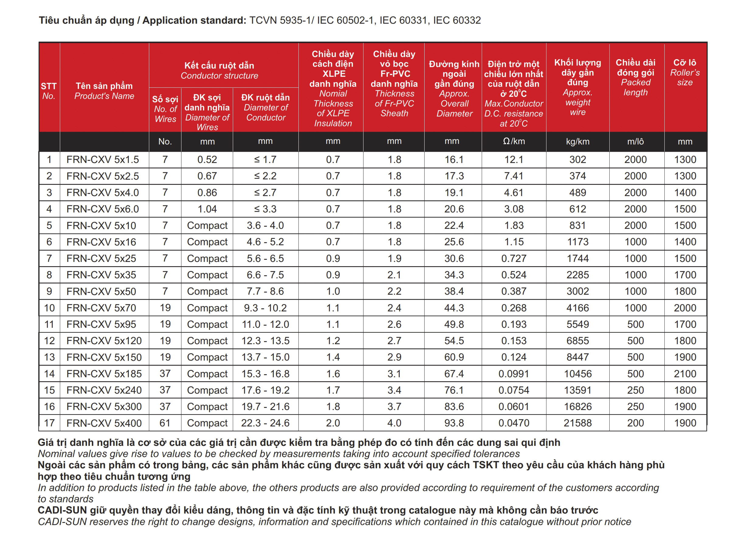 TCVN 5935-1/IEC 60502-1, IEC 60331-21, IEC 60332-3-24, BS 6387 2.Tổng quan Cáp chống cháy CADISUN FRN-CXV 5X