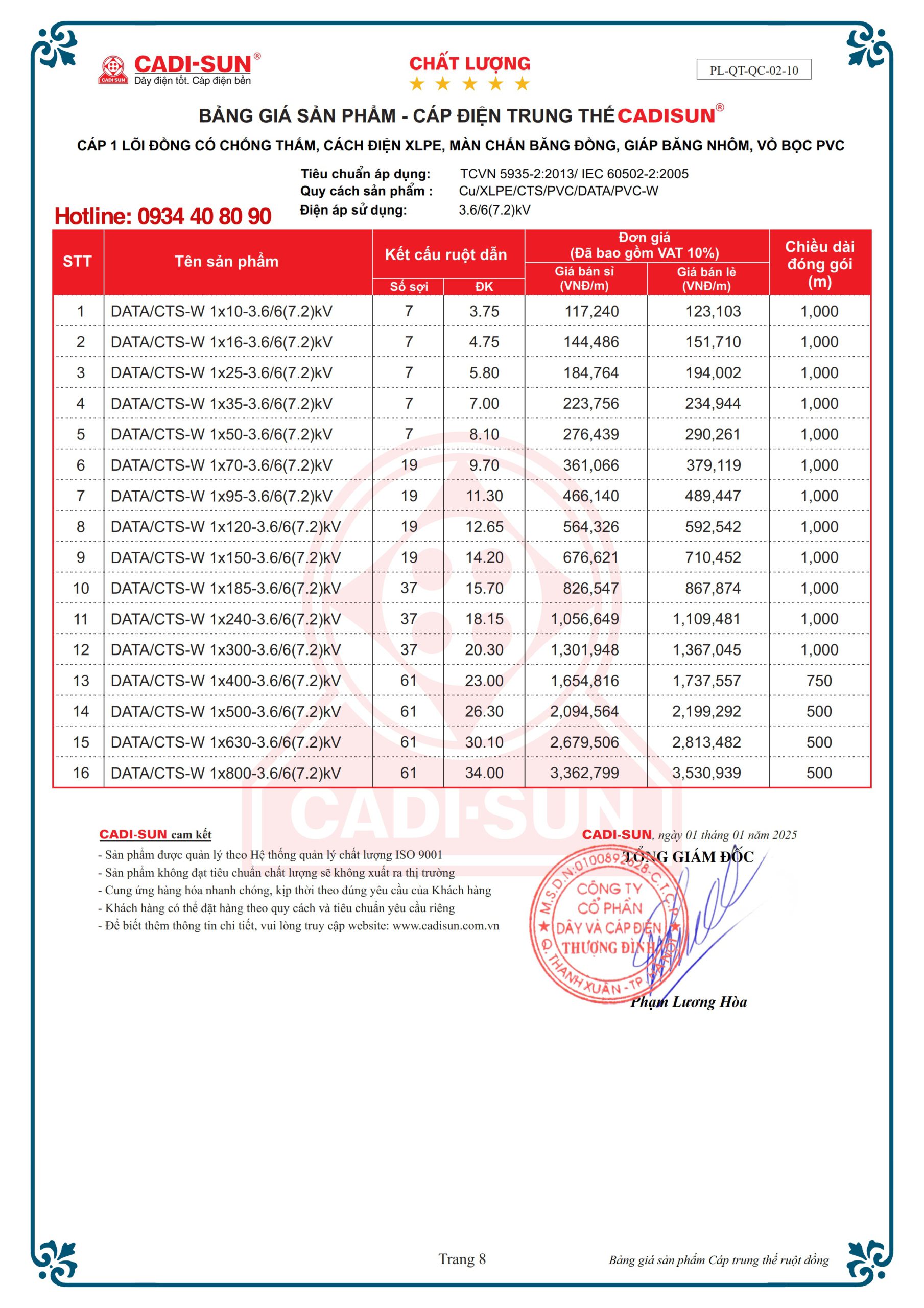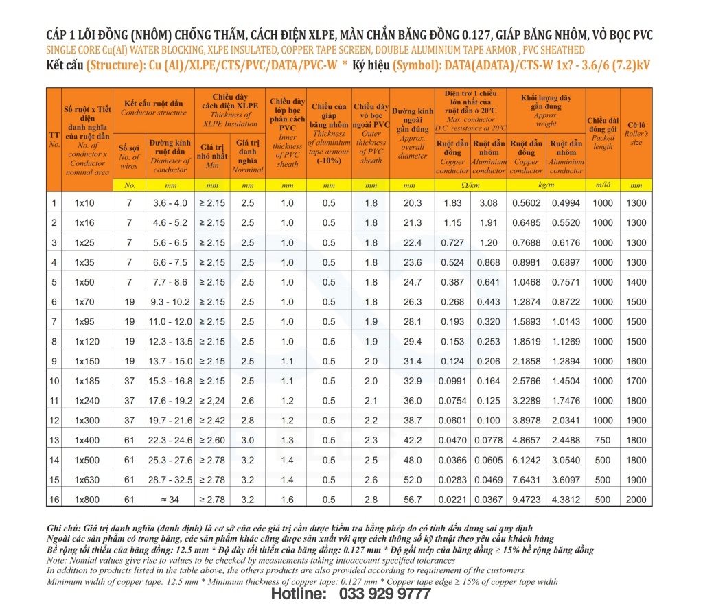 – Vật liệu: cách điện XLPE vỏ bọc PVC, Fr-PVC hoặc HDPE