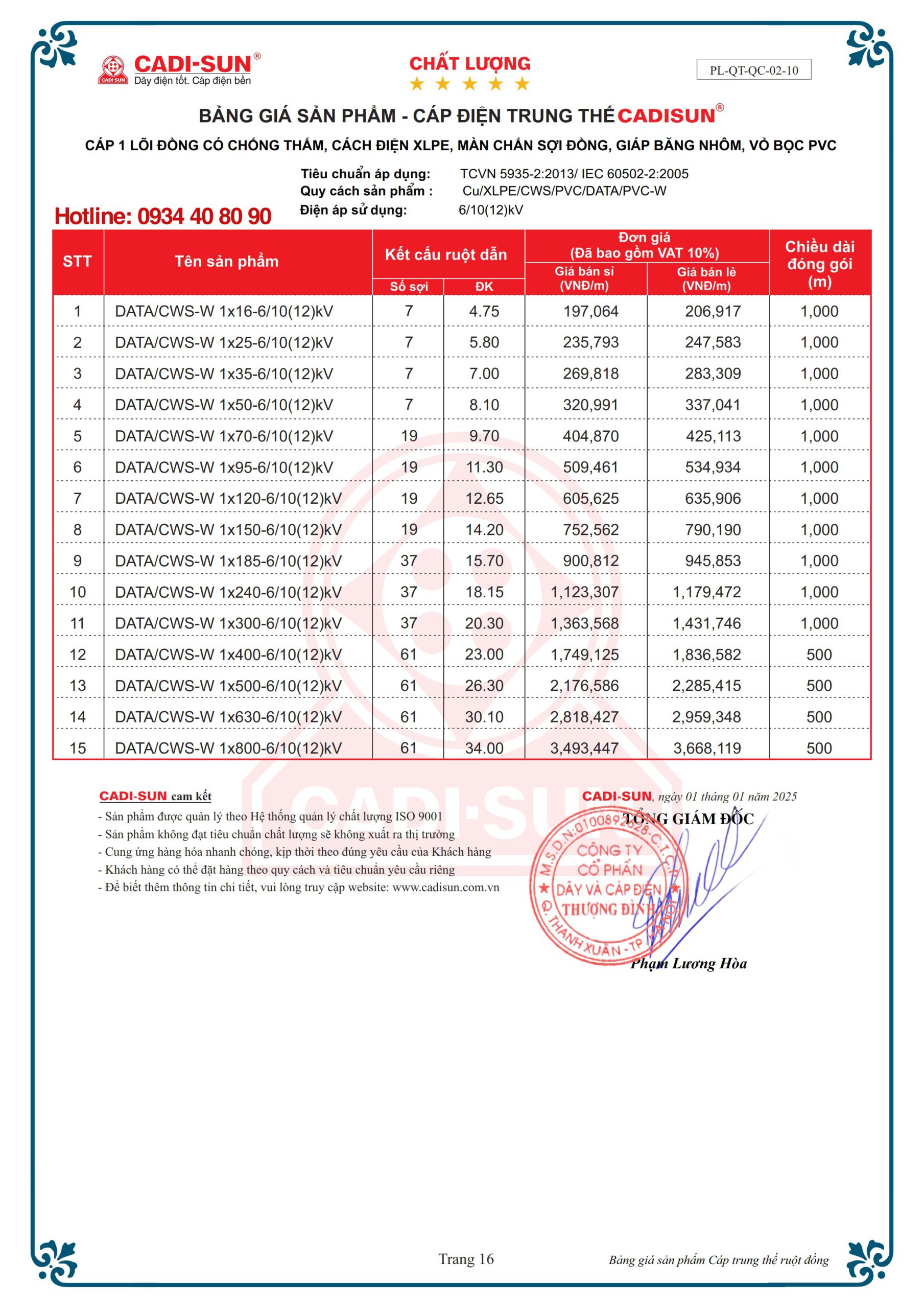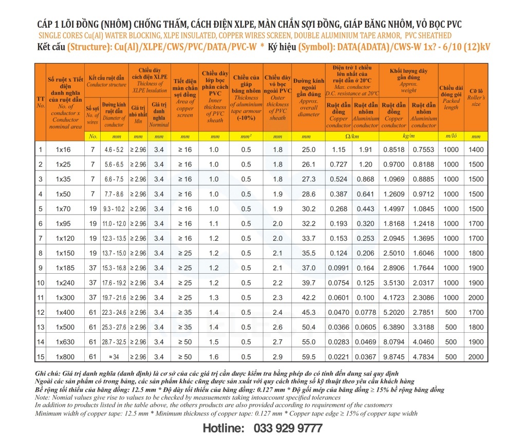 – Vật liệu: cách điện XLPE vỏ bọc PVC, Fr-PVC hoặc HDPE