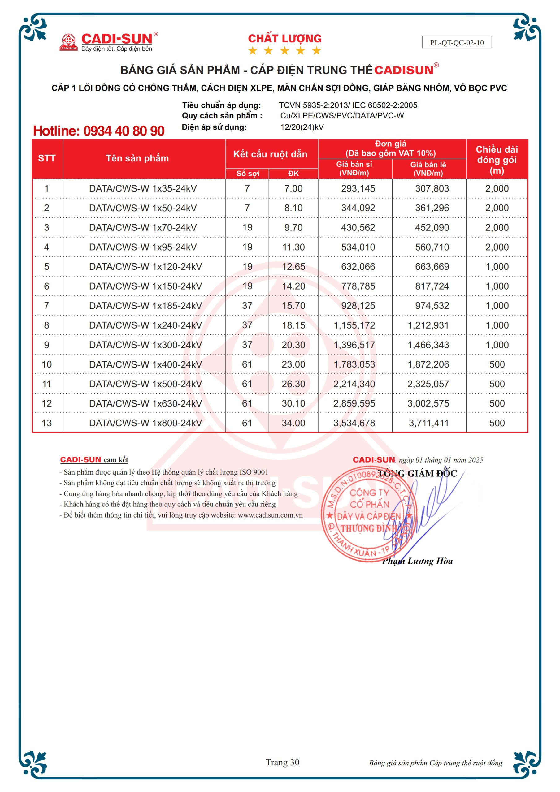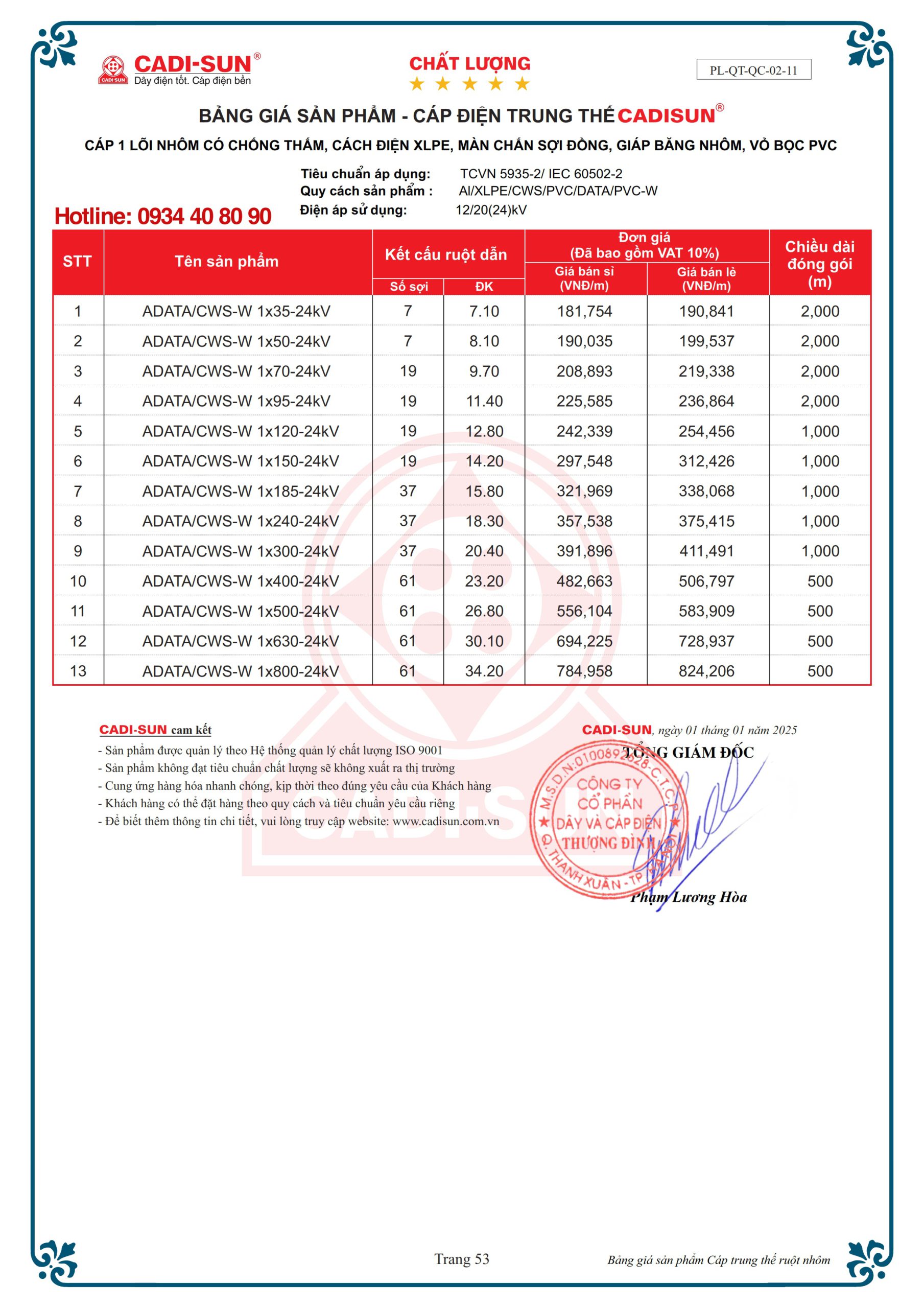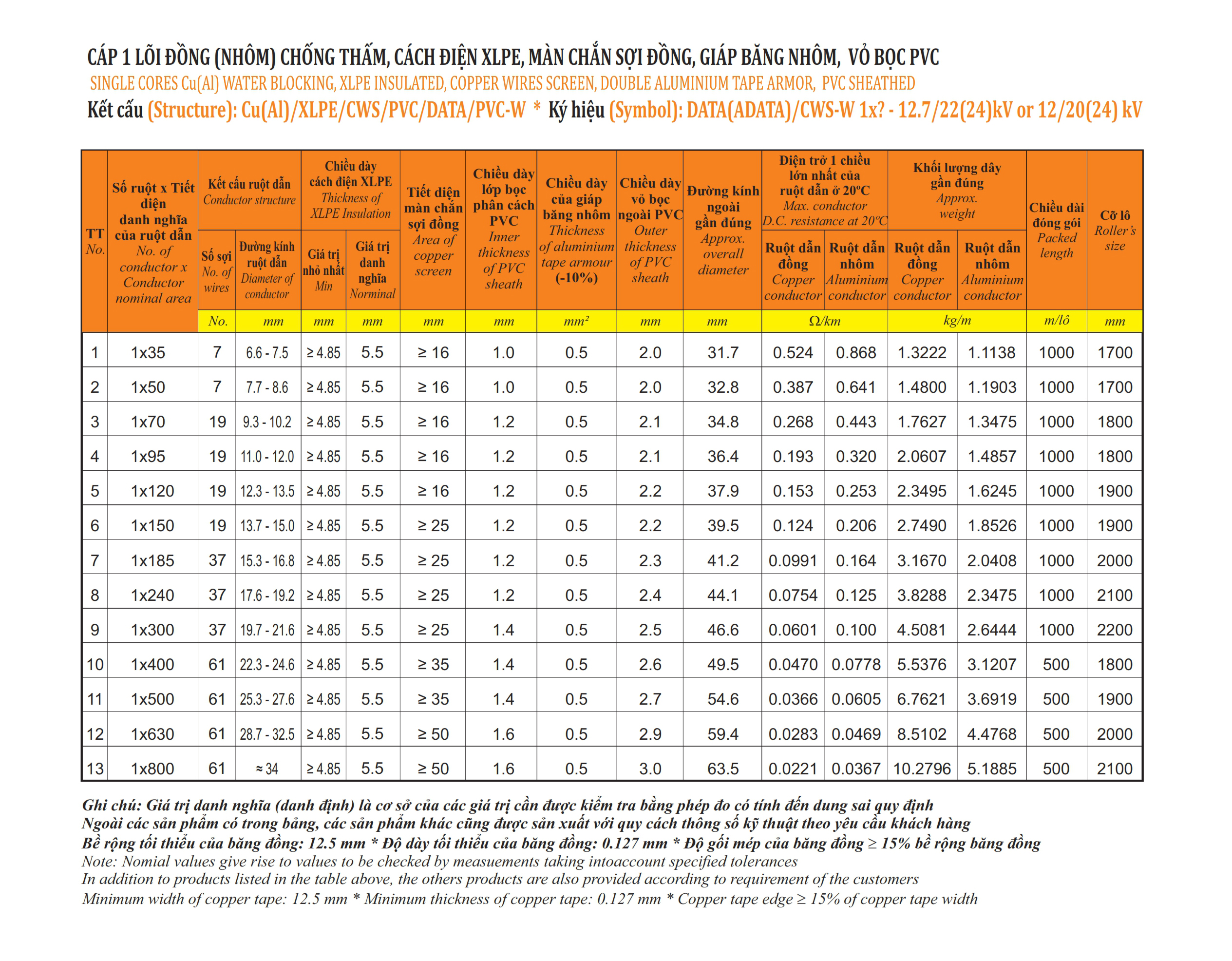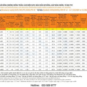– Vật liệu: cách điện XLPE vỏ bọc PVC, Fr-PVC hoặc HDPE
