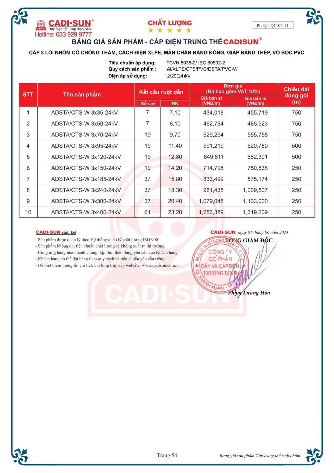 – Vật liệu: cách điện XLPE vỏ bọc PVC, Fr-PVC hoặc HDPE