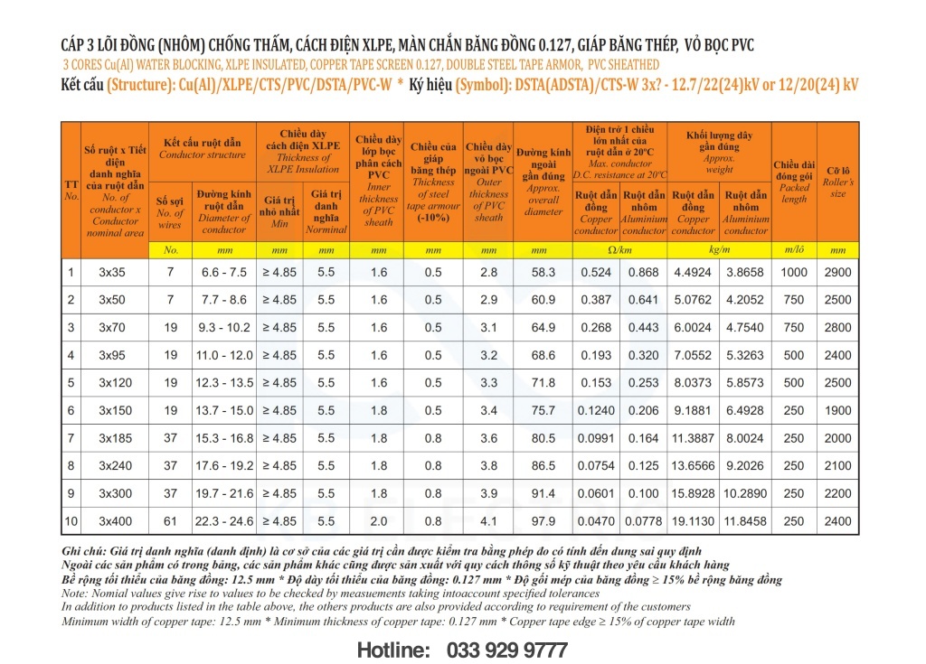 Cáp điện Cadisun 3 lõi, màn chắn băng đồng, giáp băng thép – DSTA(ADSTA)/CTS-W 3C – 12.7/22(24)kV hoặc 12/20(24) kV