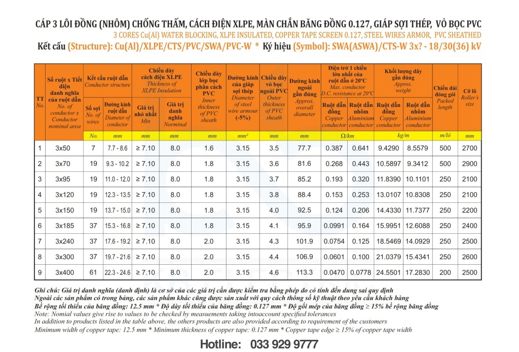 – Vật liệu: cách điện XLPE vỏ bọc PVC, Fr-PVC hoặc HDPE