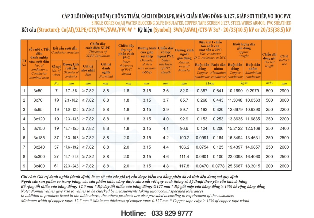 – Vật liệu: cách điện XLPE vỏ bọc PVC, Fr-PVC hoặc HDPE