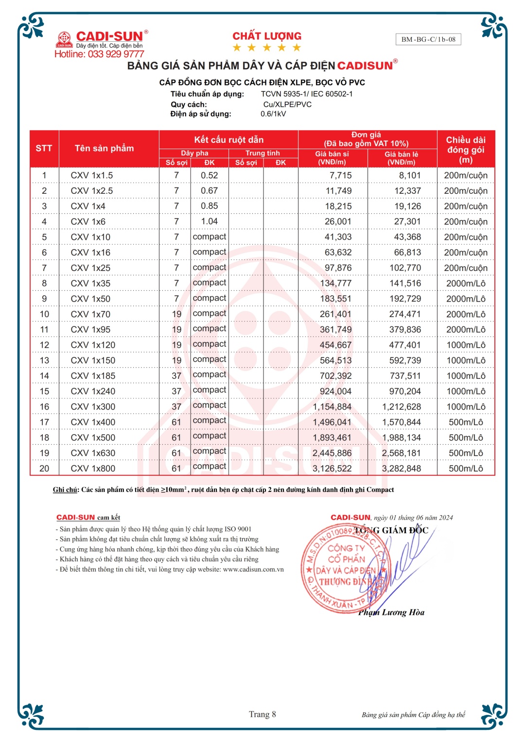 * Ghi chú: Ngoài các quy cách nêu trên, CADI-SUN có thể đáp ứng các yêu cầu khác của khách hàng.