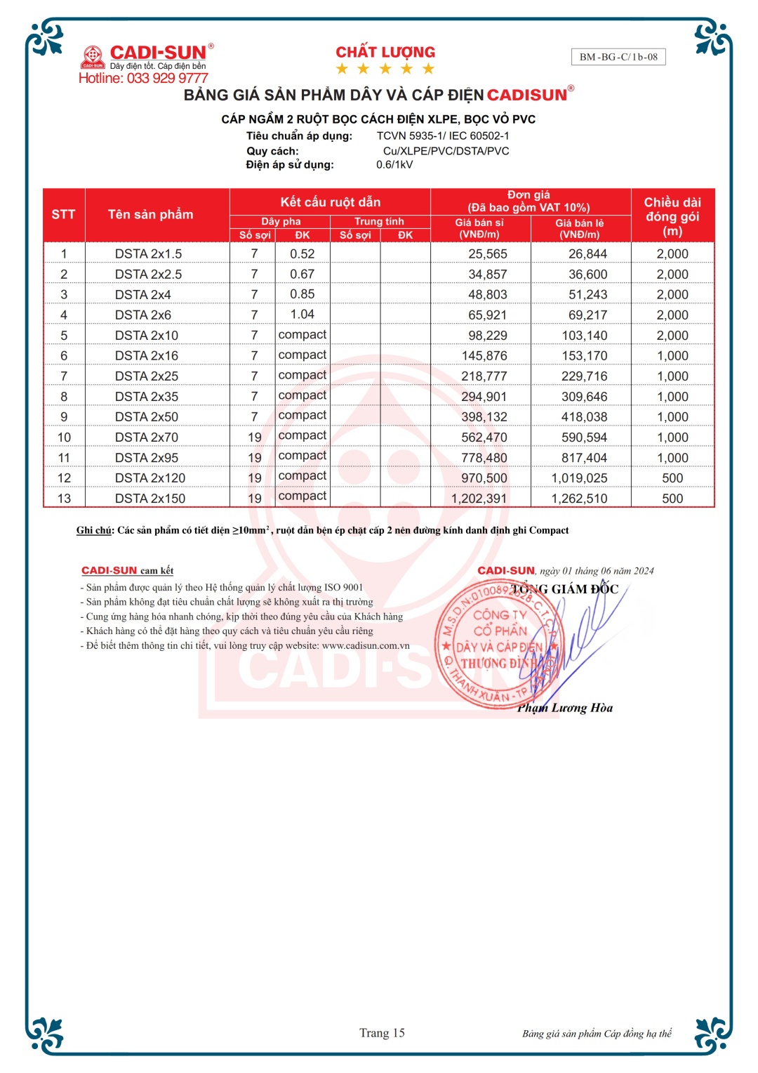 – Quy cách: Cu/XLPE/PVC/DSTA/PVC