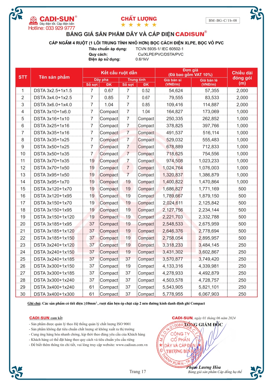 – Quy cách: Cu/XLPE/PVC/DSTA/PVC