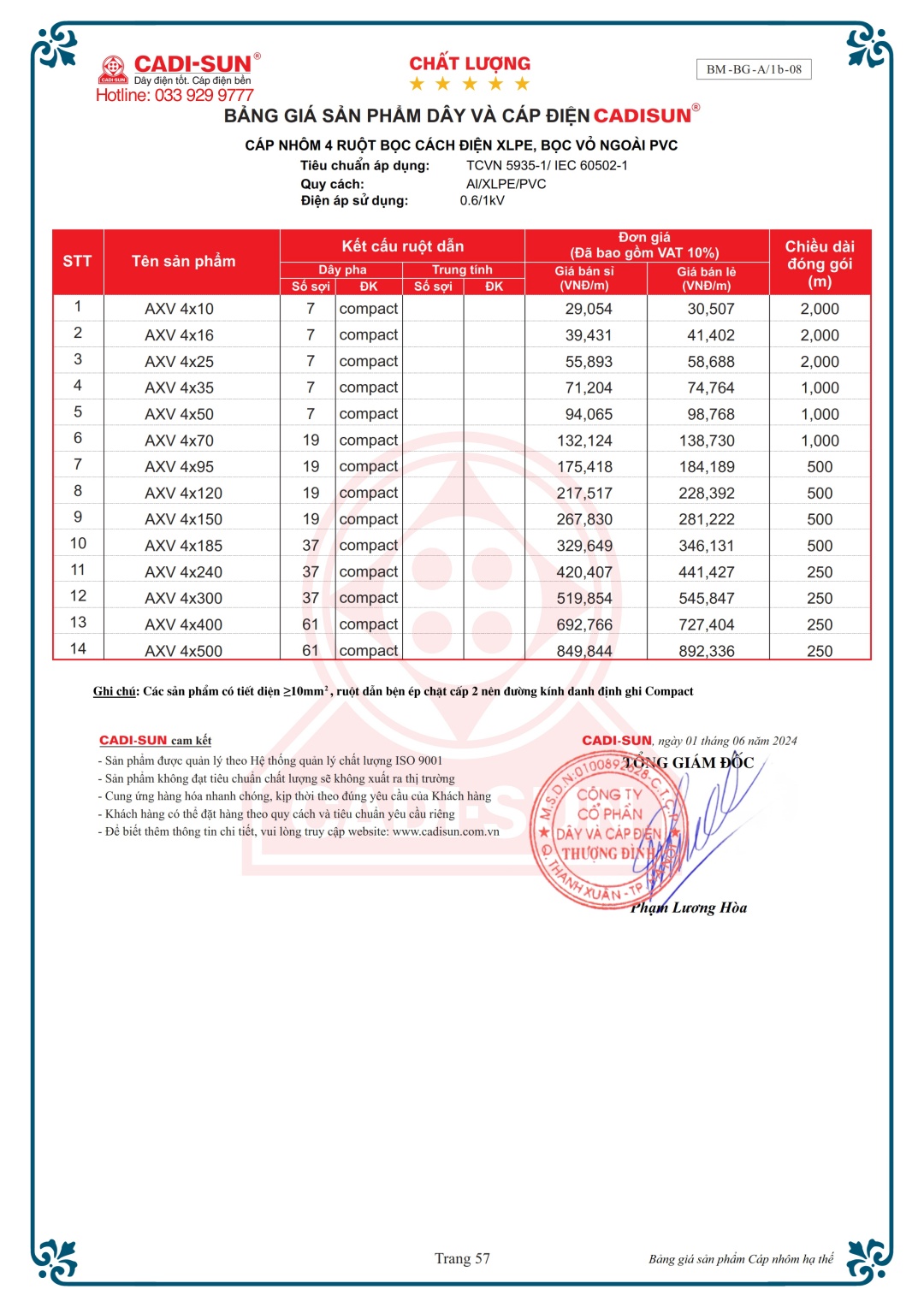 + Ruột dẫn nhôm Từ 10 mm2 đến 1000 mm2