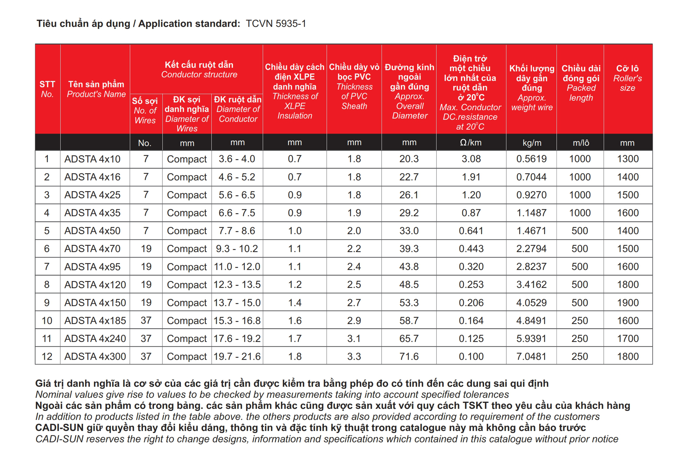 – Quy cách: Al/XLPE/PVC/DSTA/PVC